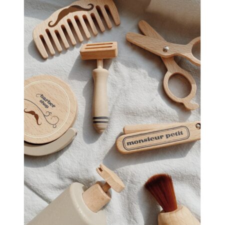 Ten niewielki zestaw gwarantuje wiele godzin zabawy Zawiera 8 części: nożyczki, golarkę, butelkę z pianką do golenia, pędzel, grzebień, lusterko, nóż fryzjerski i wąsy Zapakowane w woreczek z bawełny organicznej Testowany CE zgodnie z europejską normą EN-71-1 Wykonane z trwałego drewna bukowego Pomalowany nietoksyczną akwarelą Instrukcje czyszczenia: Czyścić wilgotną szmatką […]