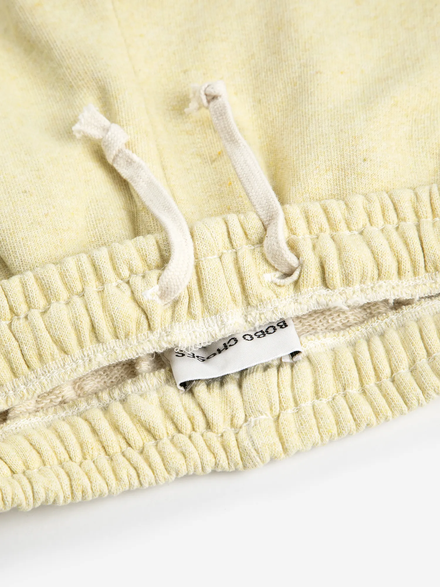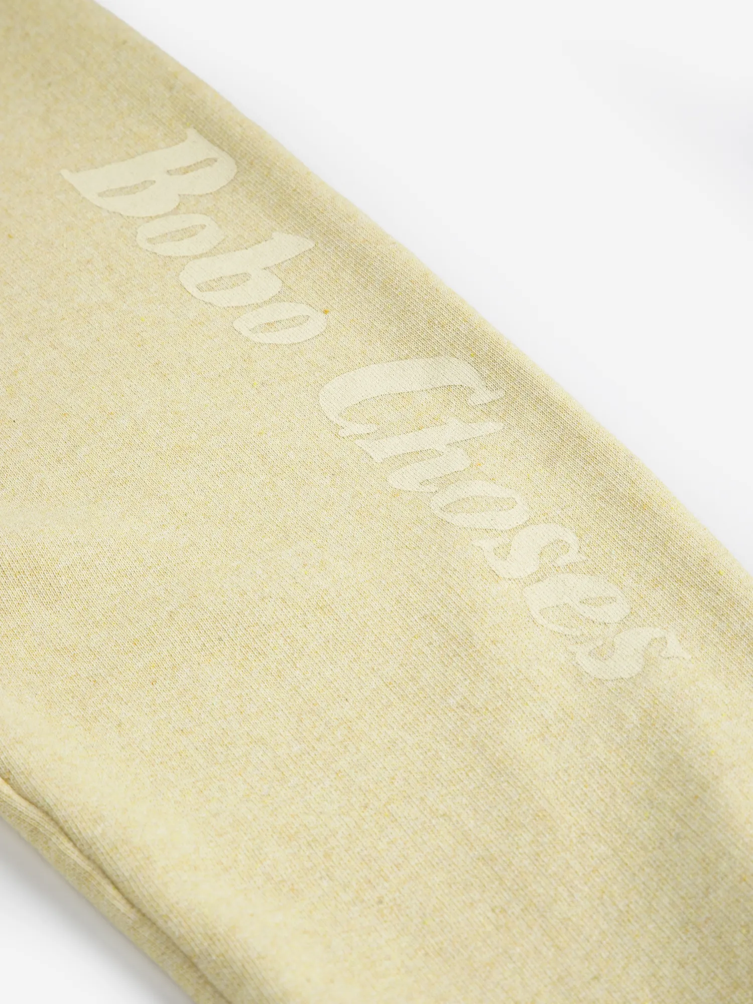 Żółte spodnie z dzianiny fleece o luźnym kroju, wykonane z mieszanki bawełny organicznej, bawełny z recyklingu oraz bawełny. Zaprojektowane z elastycznym pasem w talii i regulowanym troczkiem, ściągaczami przy nogawkach oraz praktycznymi kieszeniami – naszywaną i w szwie. Długość do kostek zapewnia komfort i swobodę ruchów. Wyprodukowane w Hiszpanii.