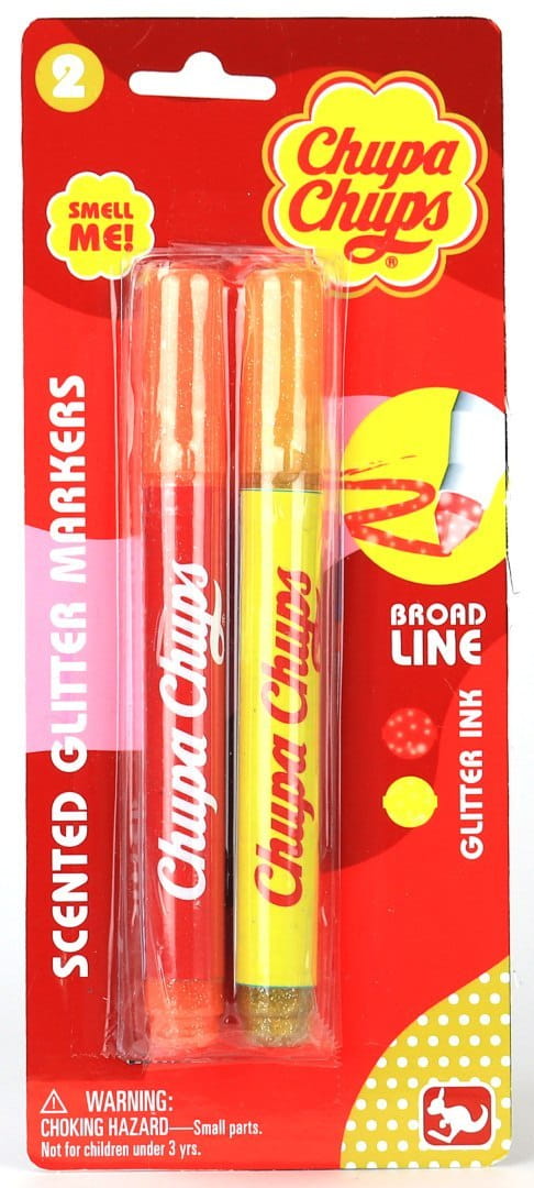 Brokatowe flamastry zapachowe Chupa Chups® to zestaw dwóch kolorowych markerów, które emitują zapachy odpowiadające smakom lizaków Chupa Chups®. Każdy kolor ma inny kolor i zapach. Dodatkowo flamastry zawierają drobinki brokatu, które dodadzą blasku każdej pracy kreatywnej.