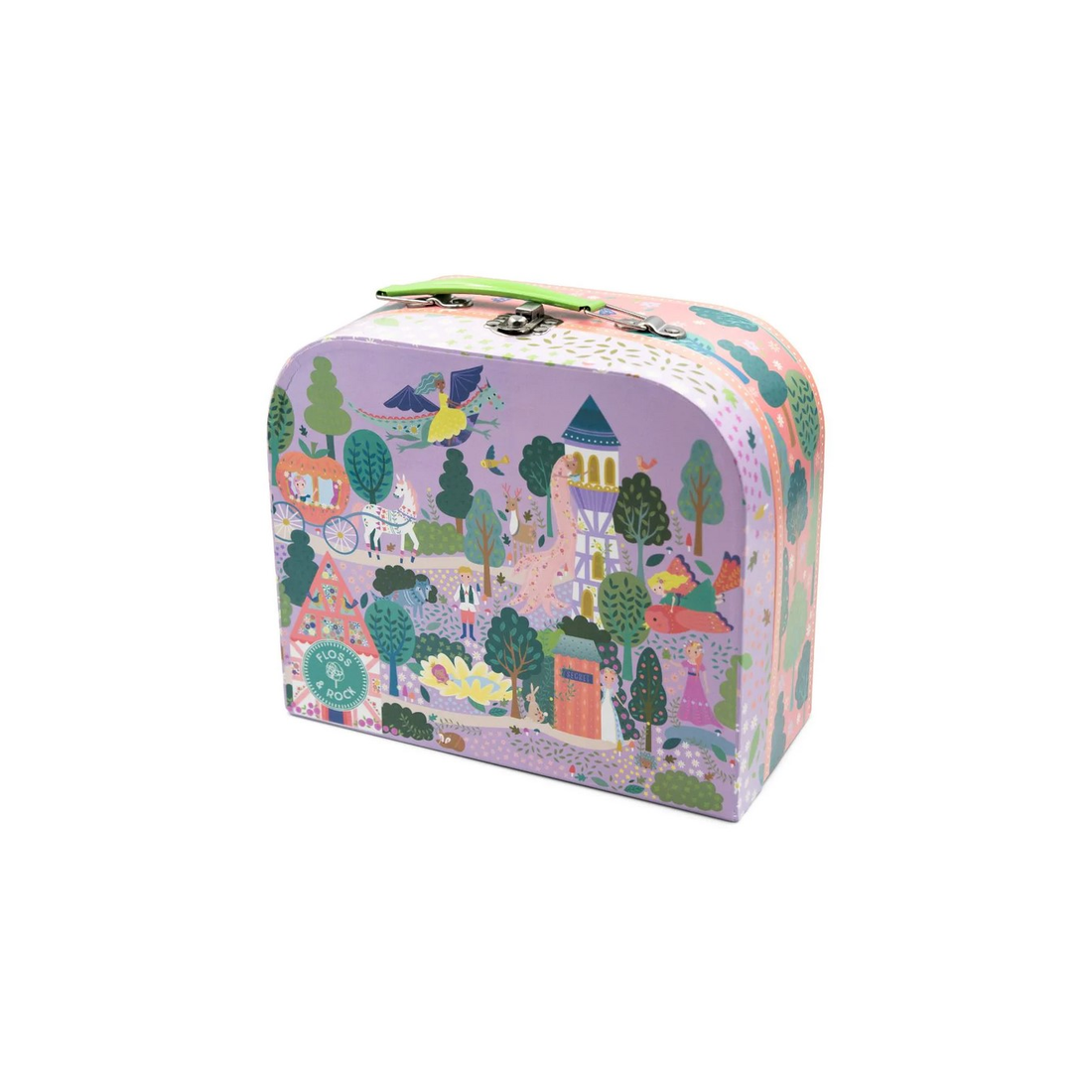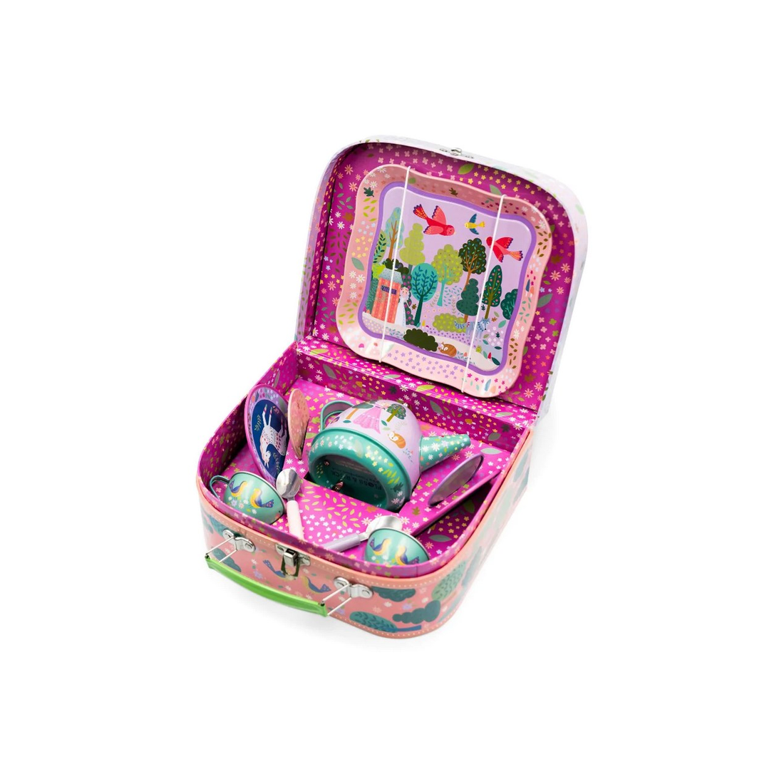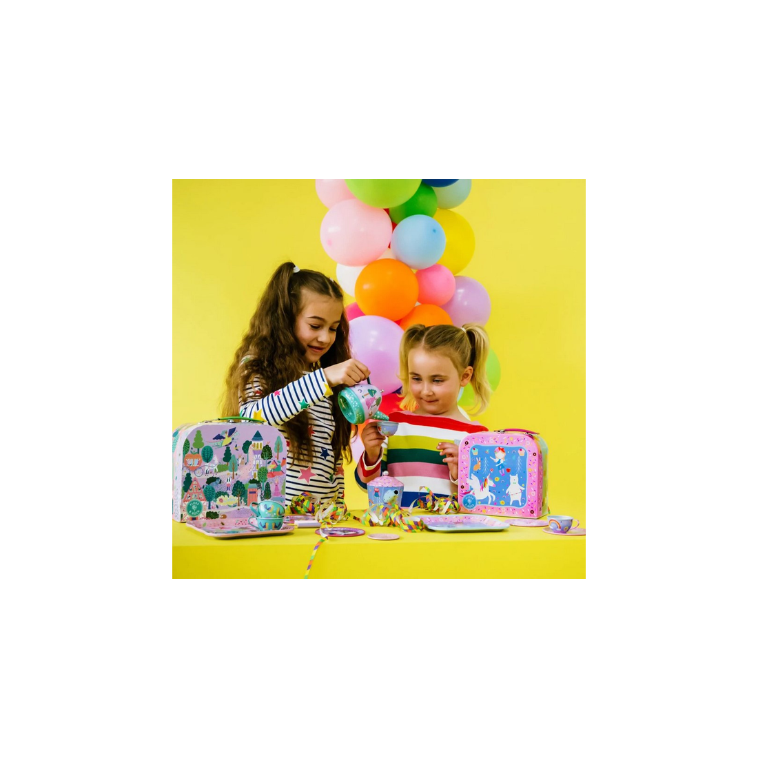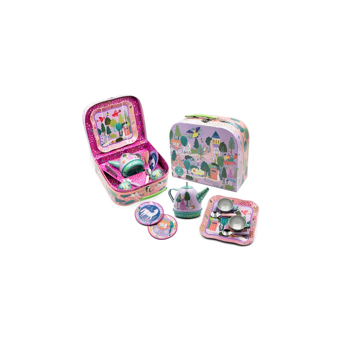 Zestaw do herbaty dla dzieci Bajkowy Świat ozdobiony jest ilustracjami księżniczek, smoków, bajkowych wież, karet z dyni i innych bajkowych elementów. W kolorowej walizeczce znajdziecie fantastyczny grający czajniczek z melodią „Teddy Bears’ Picnic”, dwie filiżanki, dwa spodki, dwa talerzyki, tacę i inne akcesoria. Zestaw do herbaty dla dzieci pozwala na zabawę w dom i odgrywanie ról, stanowiąc również świetną propozycję zabawy dla grupy dzieci. Uczy umiejętności społecznych i nawiązywania relacji. Walizeczka wyposażona jest w poręczny uchwyt, dzięki czemu można ją łatwo przenosić z miejsca na miejsce.