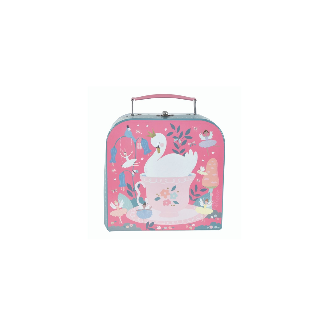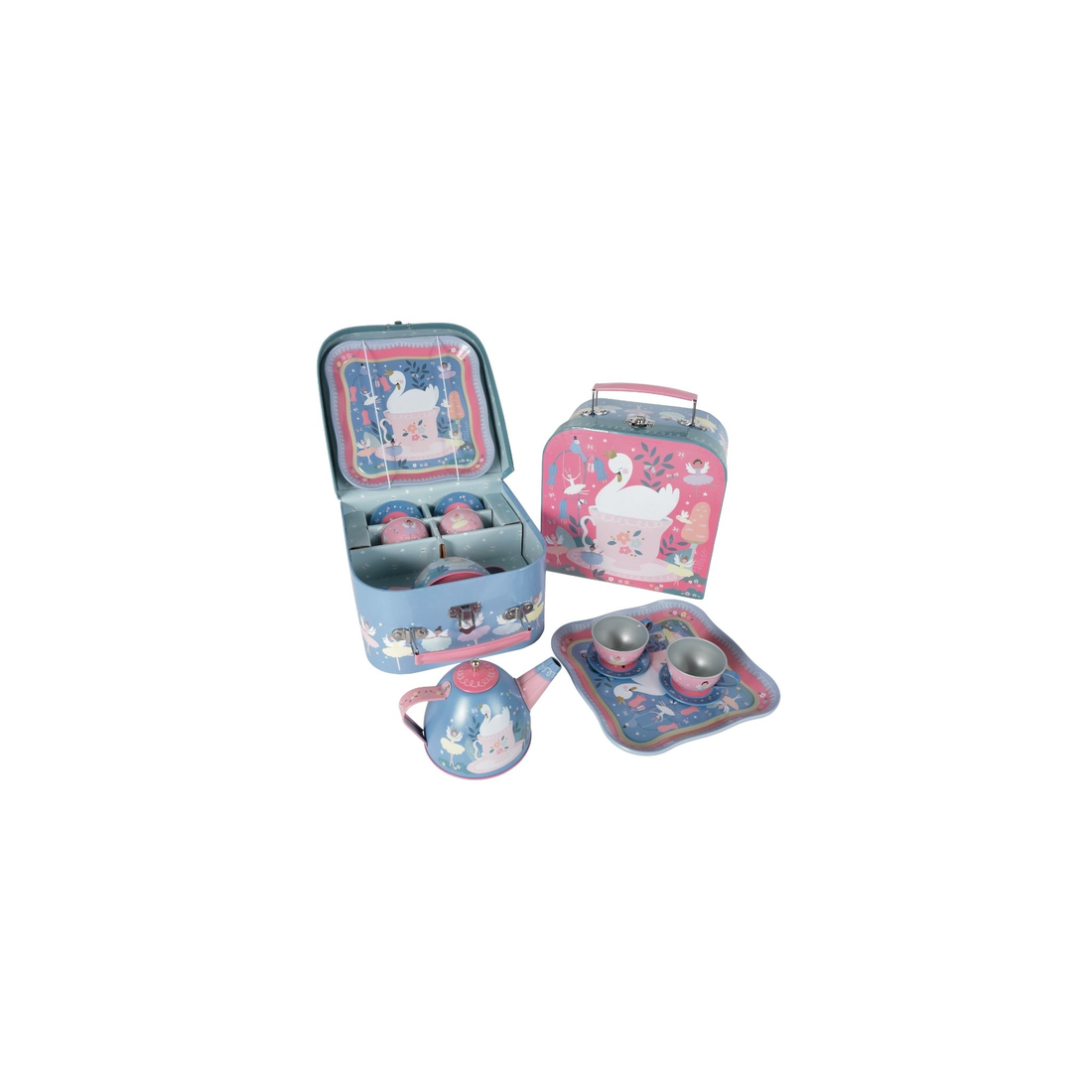 Zestaw do herbaty dla dzieci Baletnice ozdobiony jest pięknymi ilustracjami baletnic, łabędzi i leśnych przyjaciół. W kolorowej metalowej walizeczce znajdziecie czajniczek, dwie filiżanki, dwa spodeczki i tacę. Zestaw pozwala na zabawę w dom i odgrywanie ról, stanowiąc również świetną propozycję zabawy dla grupy dzieci. Uczy umiejętności społecznych i nawiązywania relacji. Walizeczka wyposażona jest w poręczny uchwyt, dzięki czemu można ją łatwo przenosić z miejsca na miejsce.