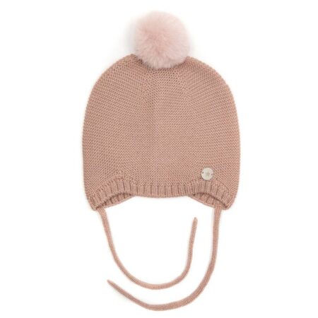 Czapka dla niemowlaka wykonana w 100% z dzianiny wełnianej meriono. Wiązana pod brodą na sznureczki, posiada słodki pompon.
