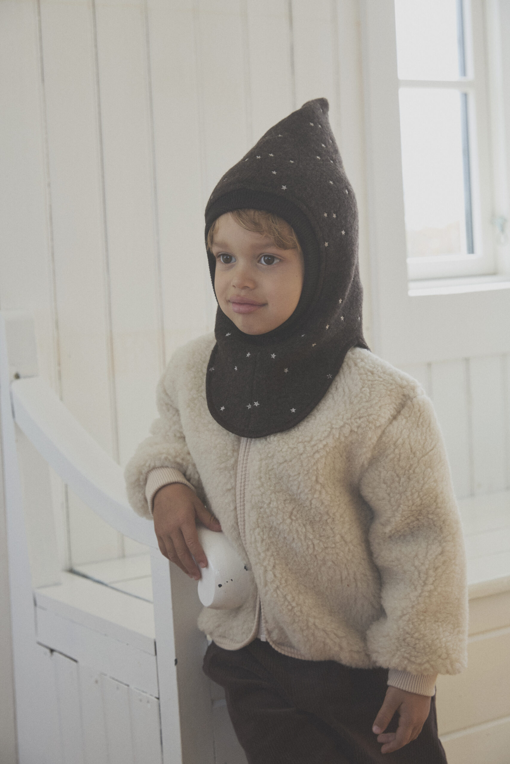 Urocza kominiarka HUTTEliHUT wykonana z miękkiej mieszanki wełny, zdobiona delikatnymi haftami na całej powierzchni. Model ma charakterystyczny, spiczasty kształt kapturka, który nadaje mu wyjątkowy wygląd.