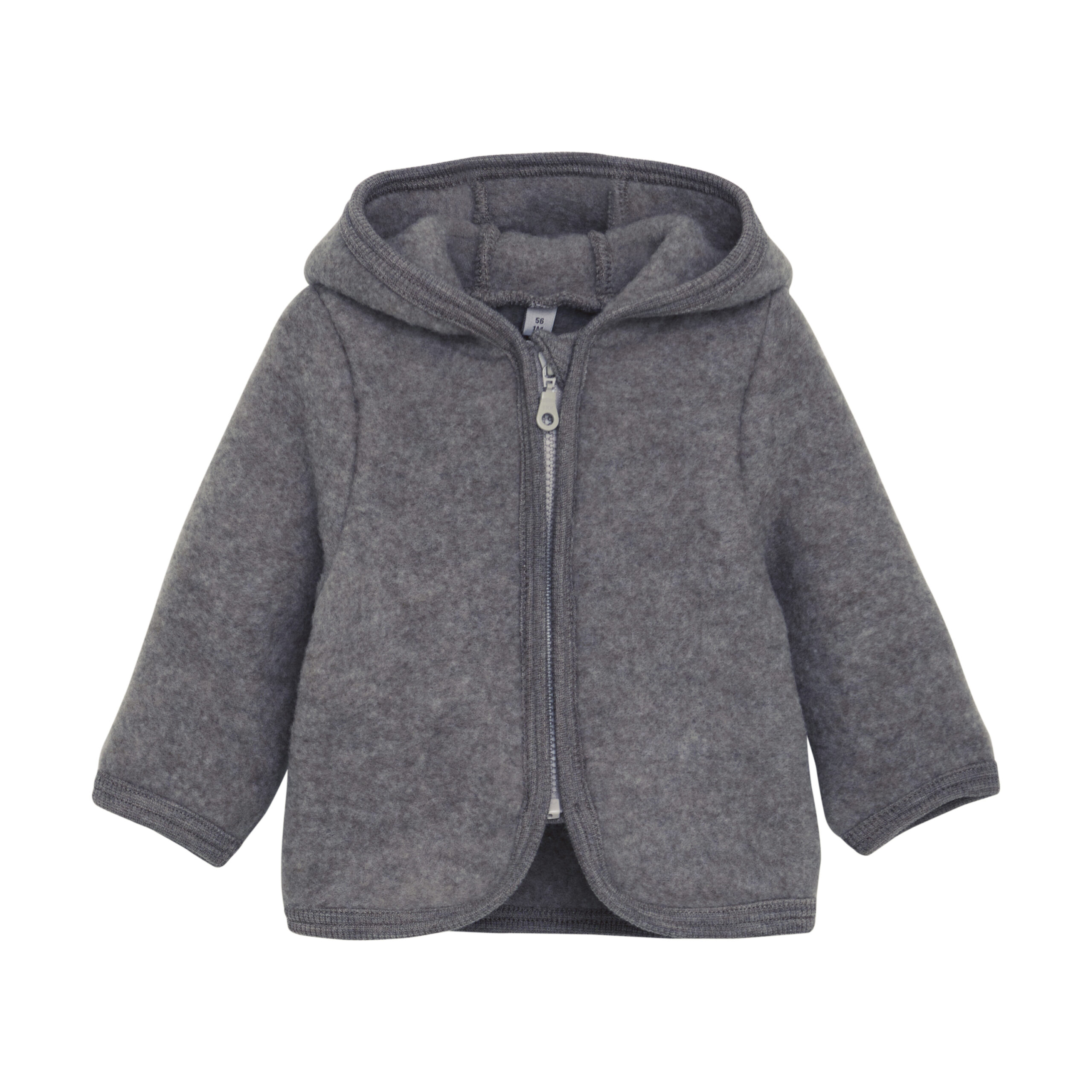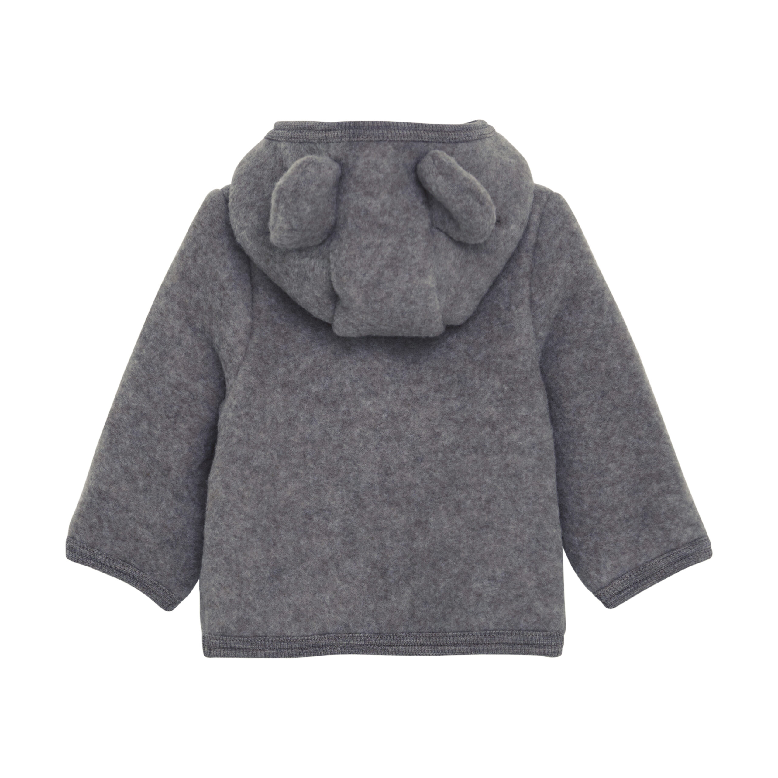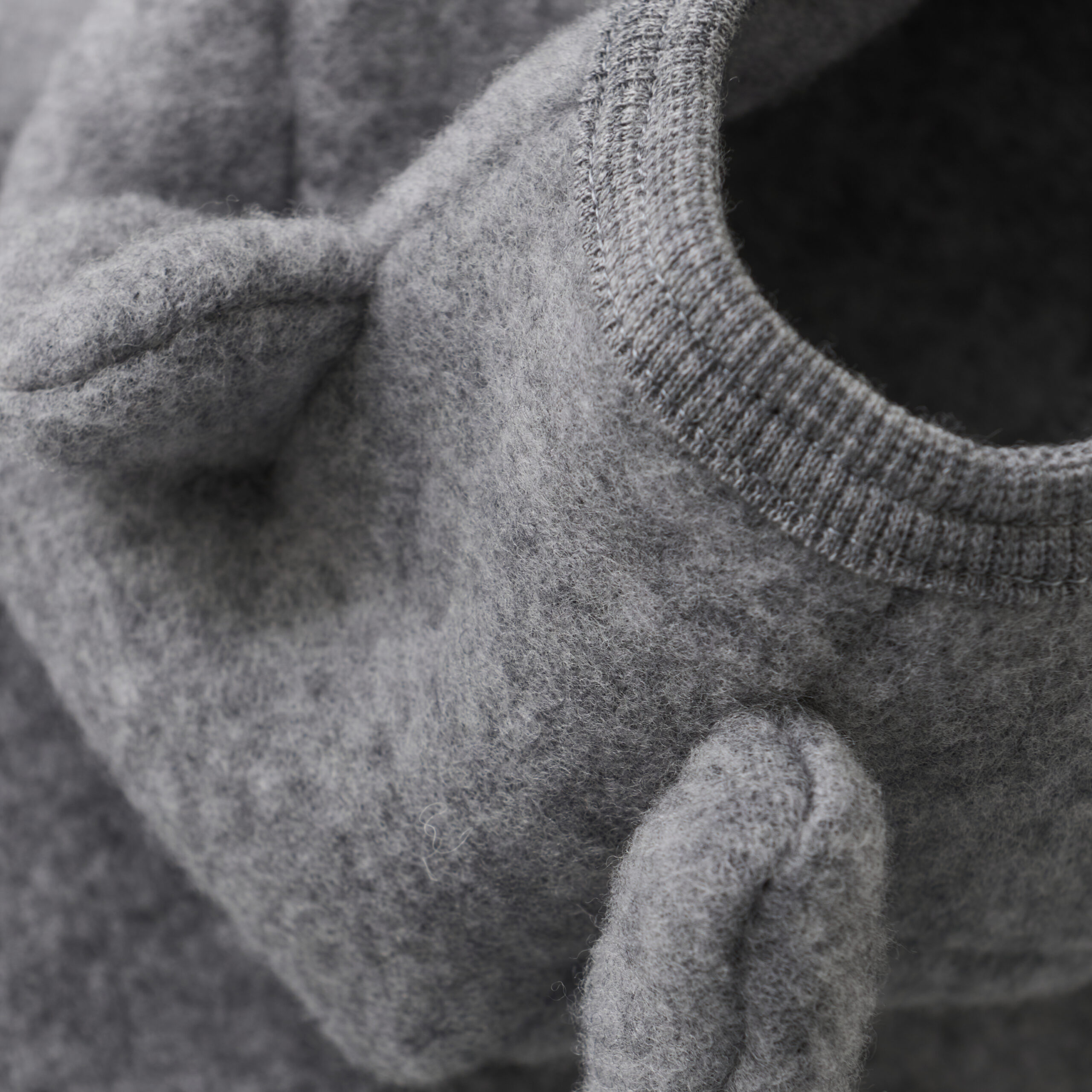 Urocza kurtka HUTTEliHUT z wełny Merino – kurtka posiada stały kaptur ozdobiony uroczymi uszami misia. Ma długie rękawy oraz miękkie, wąskie ściągacze przy wszystkich otworach. Z przodu zapinana na zamek błyskawiczny z osłoną podbródka. Wykonana z wełny merynosów.