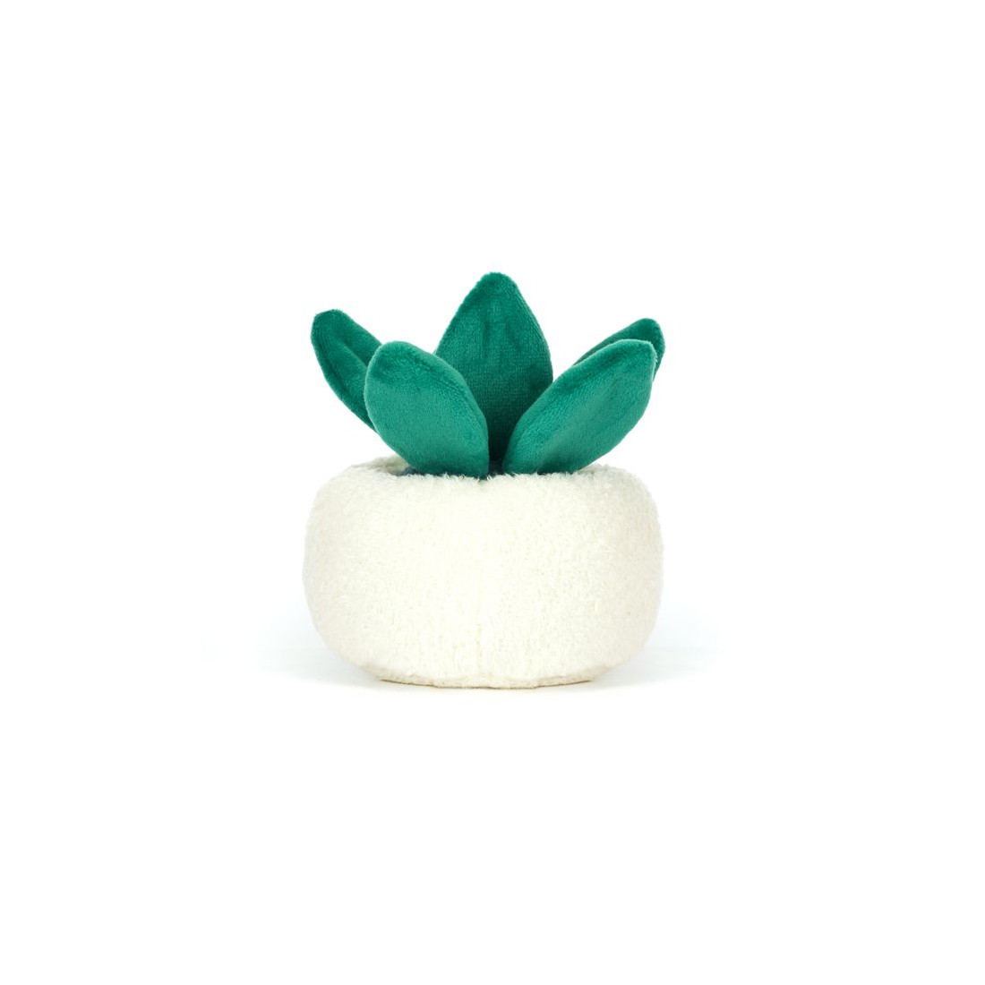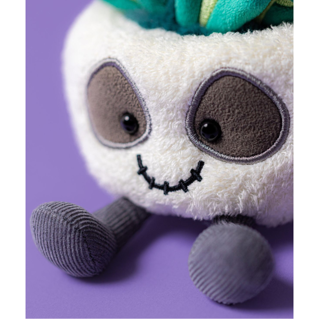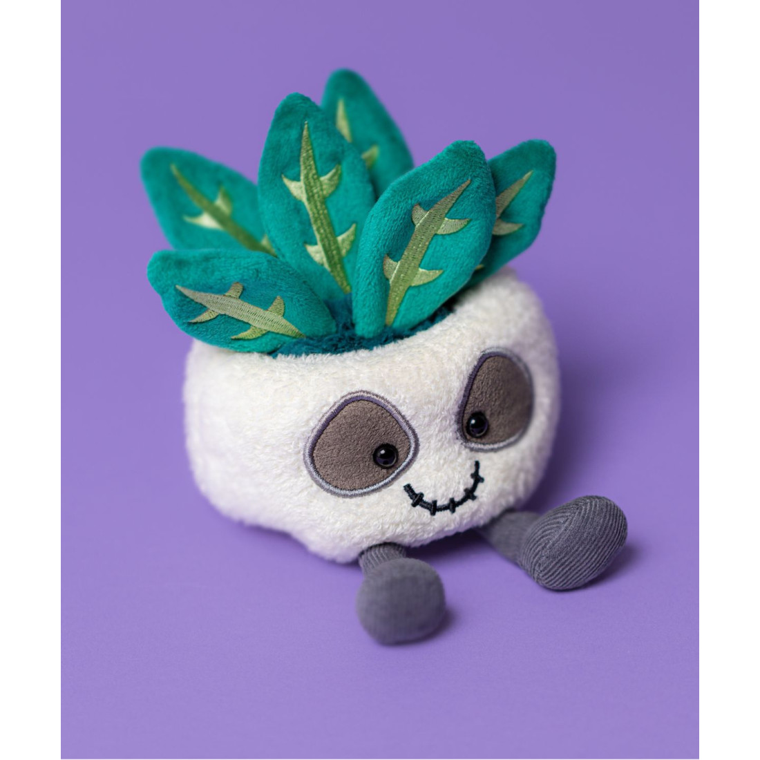 Doniczka Halloweenowa marki Jellycat London to wyjątkowo figlarny pluszak. Ma mięciutkie, kremowe futerko, błyszczące oczka, uroczy uśmiech, szare stópki oraz zielone kaktusowe listki wystające z główki. Idealna do przytulania i dekoracji, a przy tym doskonała jako prezent dla małych i dużych wielbicieli Halloween.
