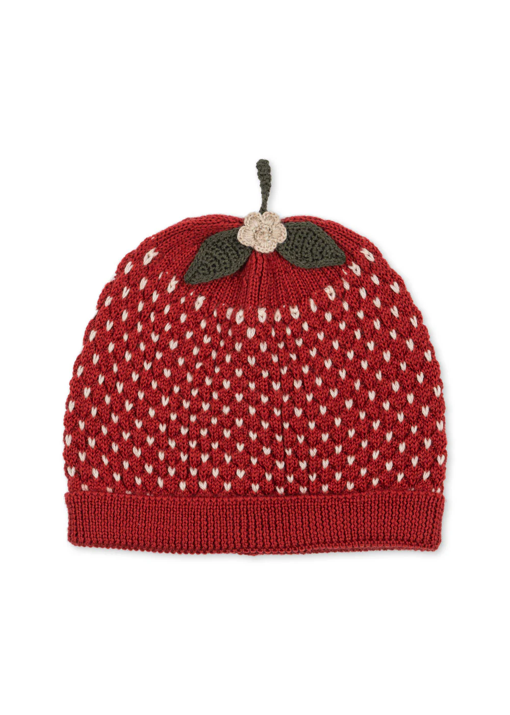 Miękka czapeczka w kształcie truskawki wykonana w 100% z wełny merynosów. Uroczy i ciepły zimowy dodatek z oddychającego, naturalnie izolującego materiału, który doskonale chroni przed chłodem.