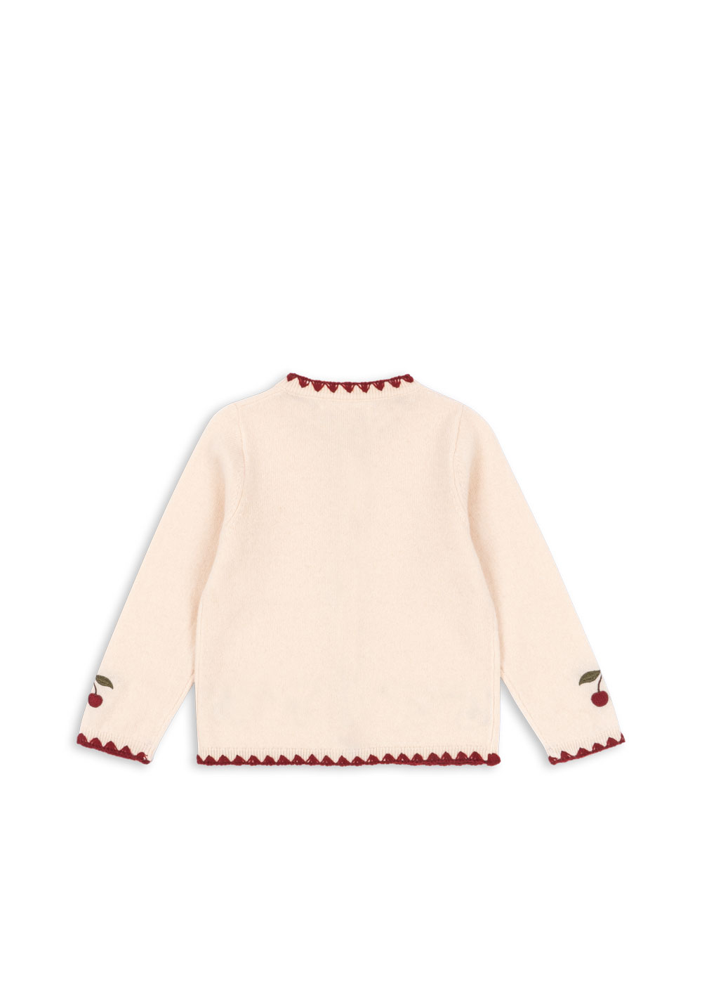 Niezwykle miękki, dziergany kardigan wykończony delikatnym haftem w wiśnie oraz kontrastową lamówką wzdłuż krawędzi. Zapinany z przodu na guziki z masy perłowej. Wykonany w 100% z wełny.