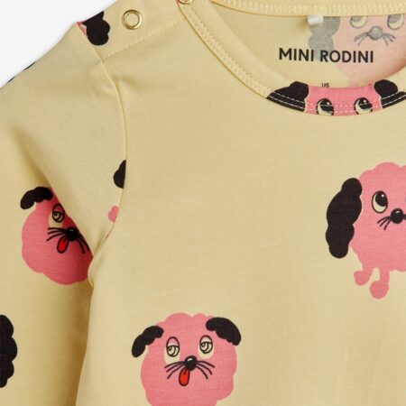 T-shirt wykonany w 100% z organicznej bawełny z certyfikatem GOTS. Posiada obniżoną linię ramion, zapewniającą luźny, komfortowy krój, i ozdobiony jest dużym nadrukiem z motywem Doggies.