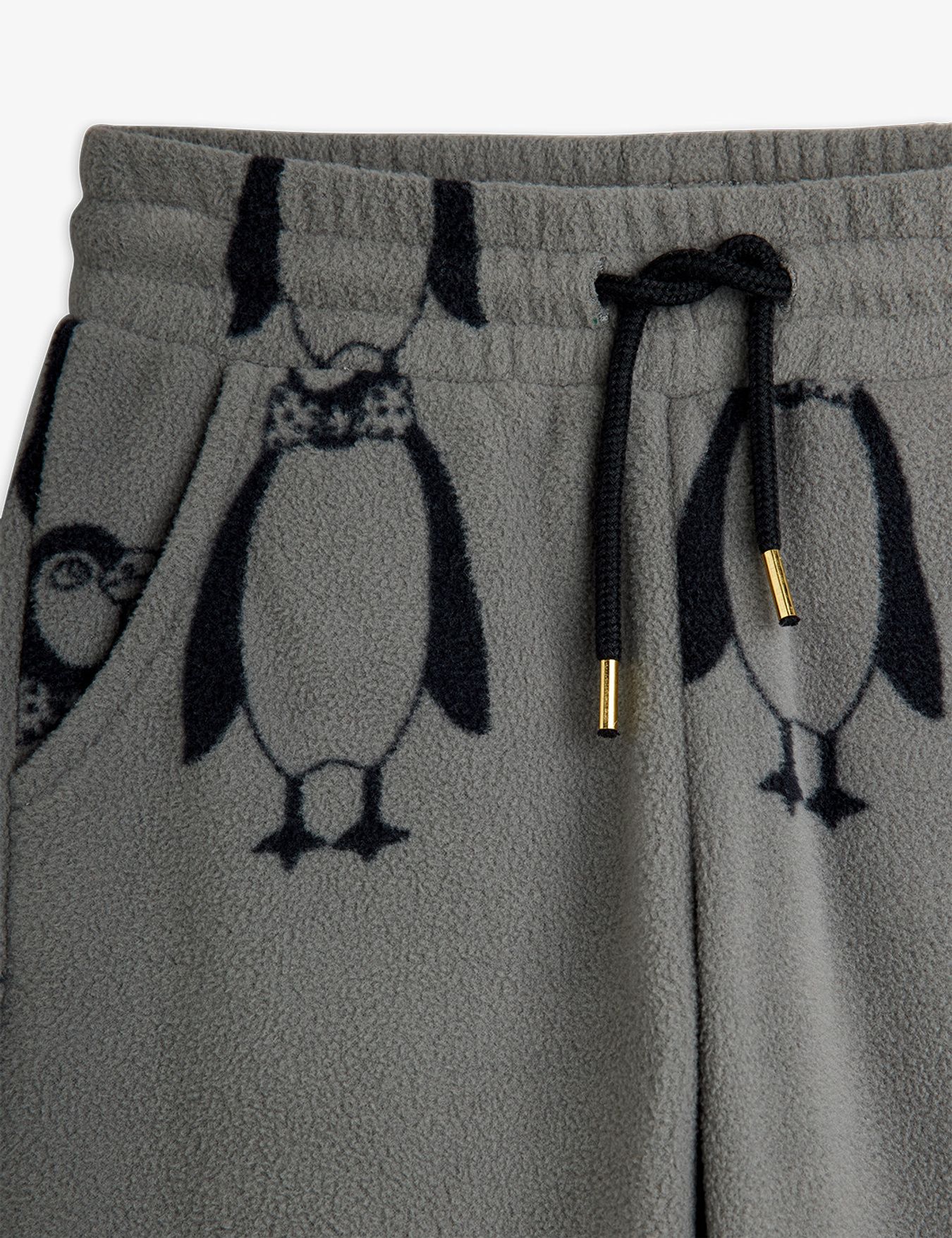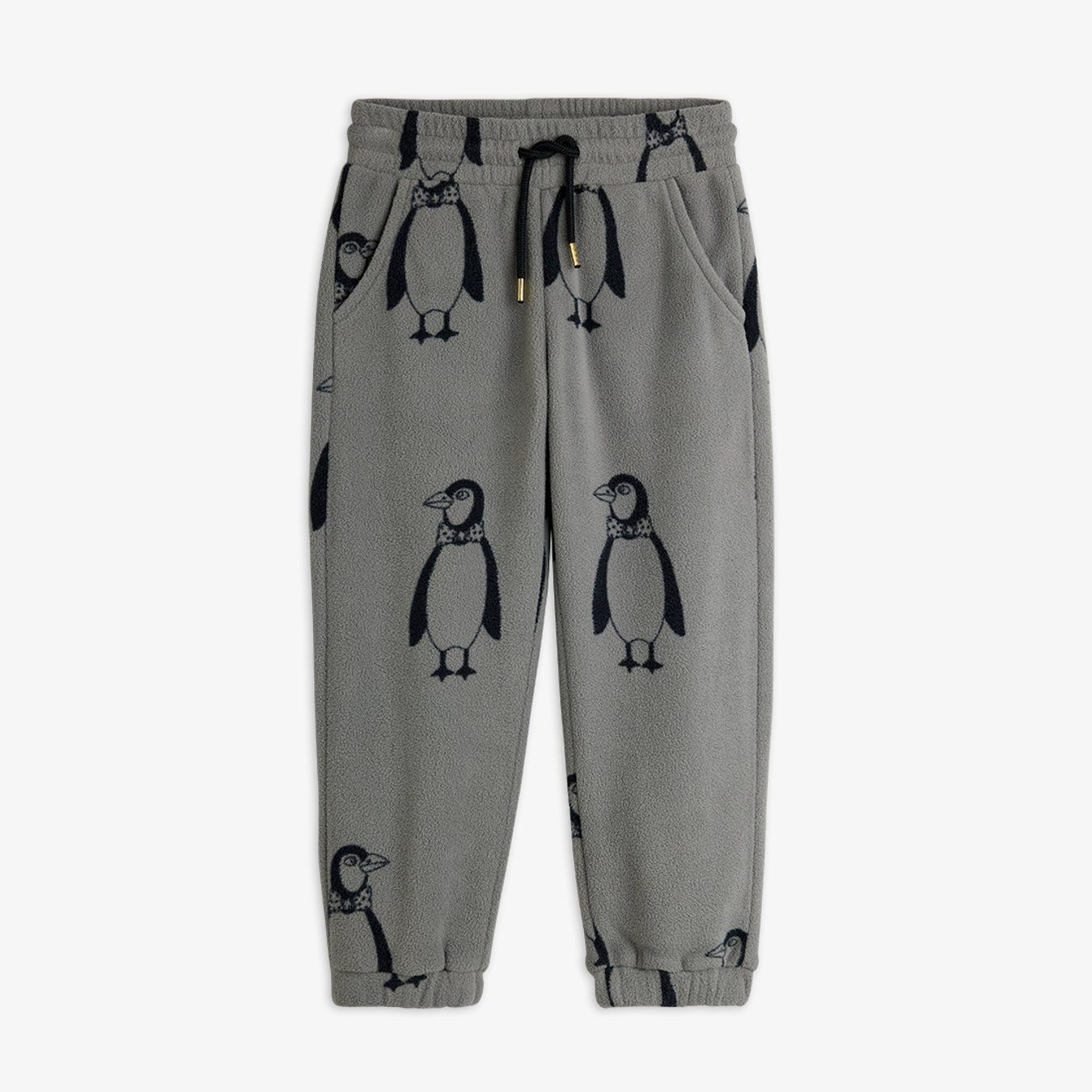 Spodnie polarowe z nadrukiem pingwina, wykonane w 100% z poliestru z recyklingu. Zaprojektowane z regulowanym elastycznym pasem, kieszeniami bocznymi i elastycznymi mankietami. Ozdobione sztuczną kieszenią z tyłu z naszywką Mini Rodini Panther. Modelka ma 124 cm wzrostu i nosi rozmiar 116/122.