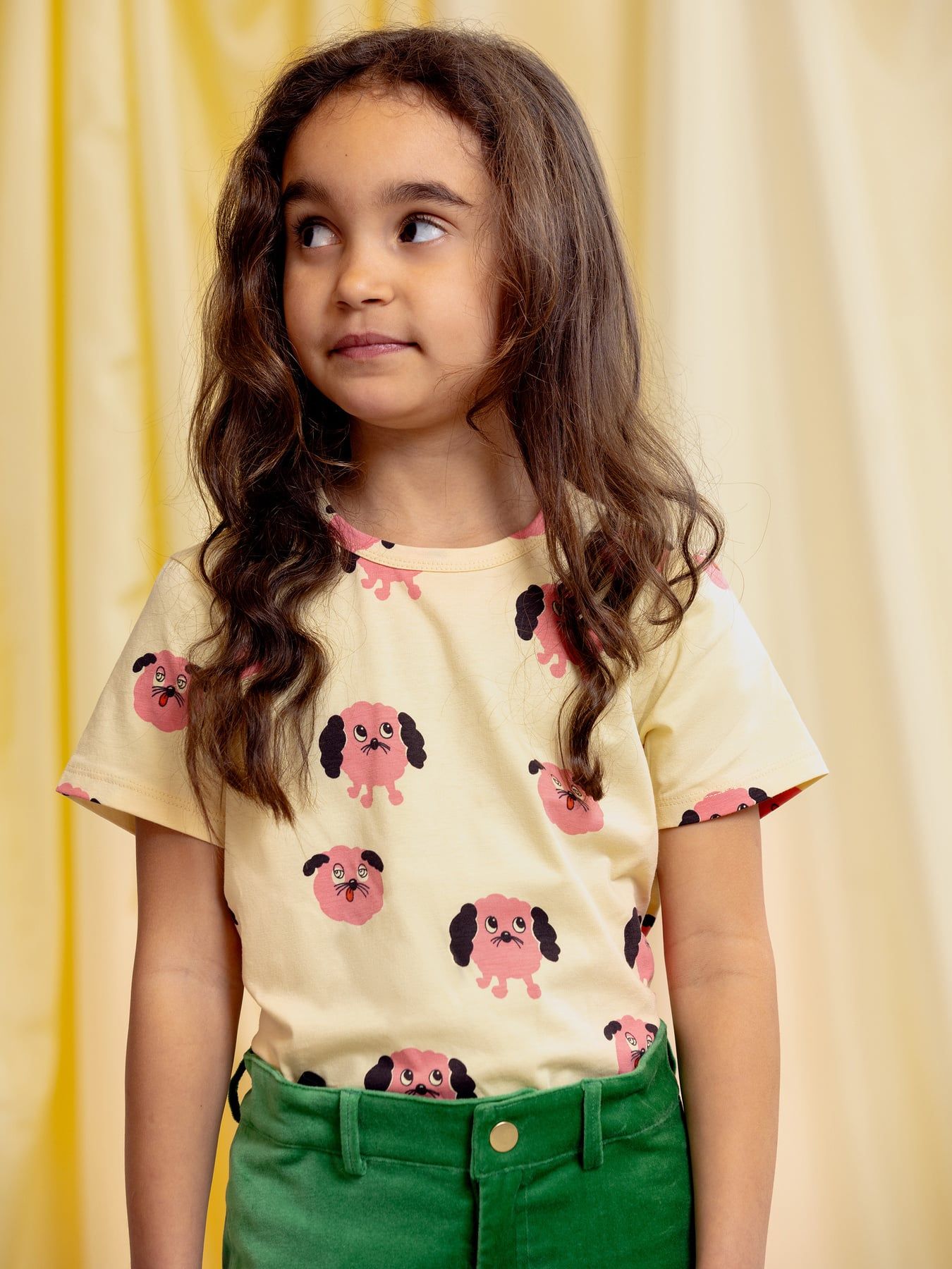 Dopasowany T-shirt wykonany z organicznej bawełny z certyfikatem GOTS z dodatkiem elastanu, zapewniającym komfort i elastyczność. Ozdobiony zabawnym nadrukiem Doggies na całej powierzchni.